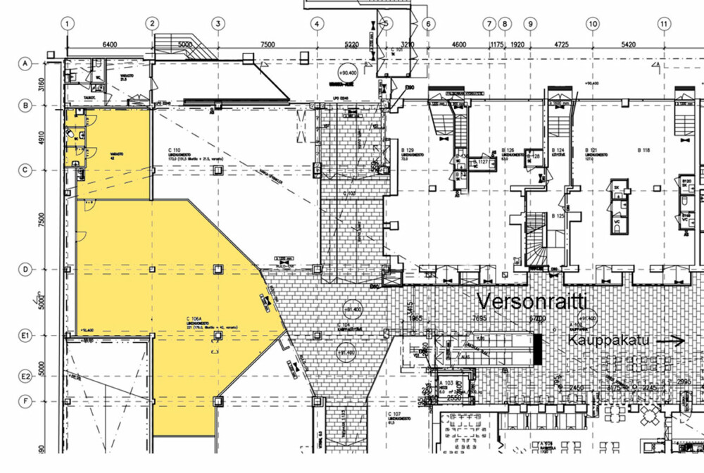 Iso monien mahdollisuuksien myymälätila, joka voidaan myös yhdistää viereisen 152m2 tilan kanssa. Tämä popup-käytössä ollut tila (pohjakuvassa keltaisella merkittya alue) voidaan vuokrata myös esim. kolmelle pienelle myymälälle. Vuokran lisäksi vesi-, sähkö- ja markkinointimaksu.